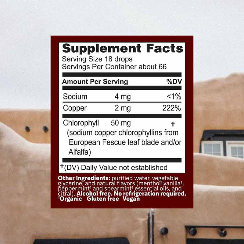 This ChlorOxygen® Mint formula is alcohol free and formulated with sodium copper chlorophyllin, a blood-supporting compound derived from Alfalfa and/or European Fescue Leaf.*