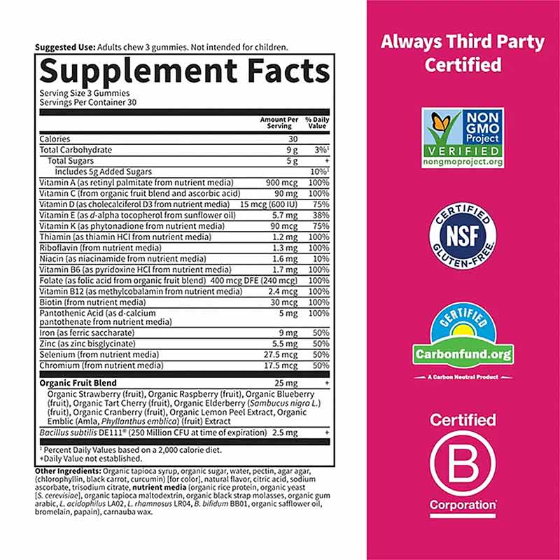 Each serving of three delicious cherry-flavored gummies provides 9mg of iron and includes nine essential vitamins at 100% of the daily value. Additionally, these gummies contain probiotics, specifically Bacillus subtilis DE111®, to further enhance digestive health.
